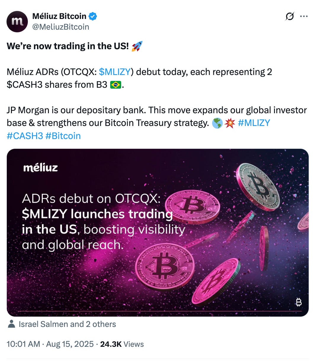 Meliuz shares are now trading in the US, per an X announcement from the company.