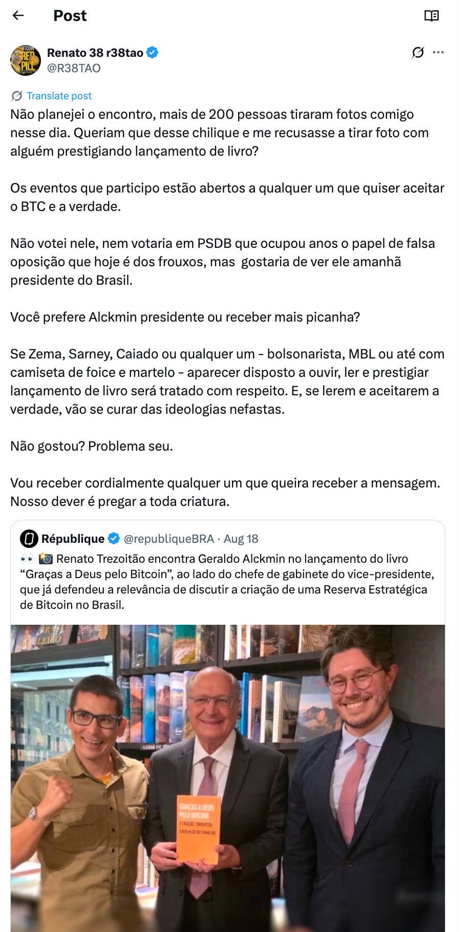 Controversial bitcoin maximalist, educator and Lula critic Renato Trezoitao was photographed alongside Brazil’s Vice President Geraldo Alckmin and his chief of staff Pedro Guerra at the launch of the Portuguese translation of the book Thank God for Bitcoin.
