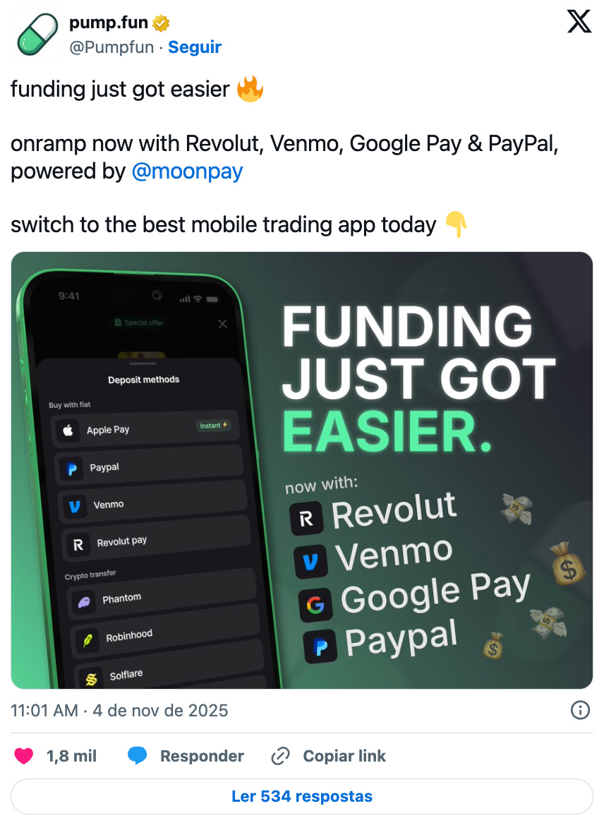 Solana-based memecoin launchpad Pump.fun has integrated Pix through MoonPay to enable Brazilian users to buy memecoins directly in-app using BRL, rather than first purchasing SOL or other tokens.