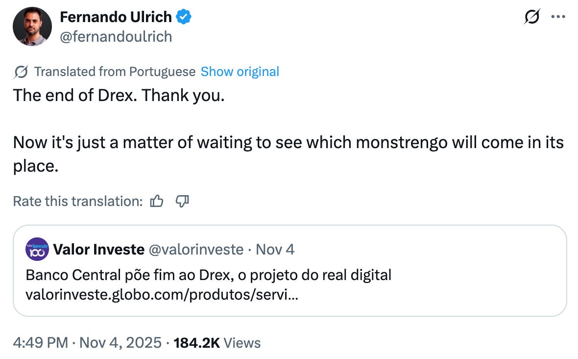 Recall that Drex was first announced in 2021 as the future of Brazilian digital currency. It mobilized banks, fintechs, and technology companies in a race to test tokenization and instant settlement use cases.