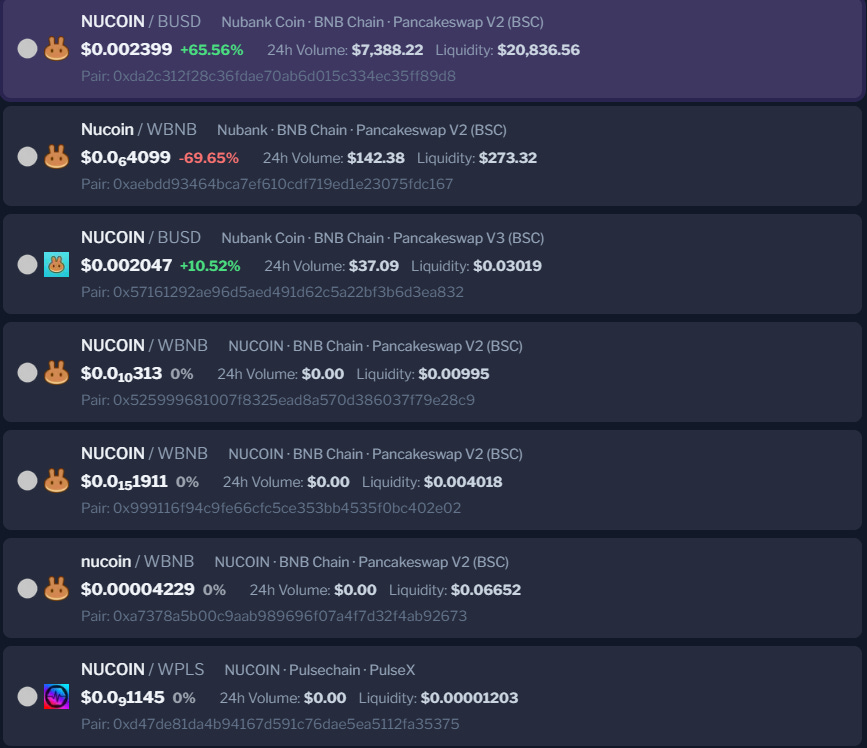 Several of these fake tokens are now available in decentralized finance liquidity pools - such as a Nucoin/BUSDd pool on PancakeSwap that had as much as R$100,000 of liquidity. At least six other fake Nucoin pools were spun up, according to CoinTelegraph Brasil.