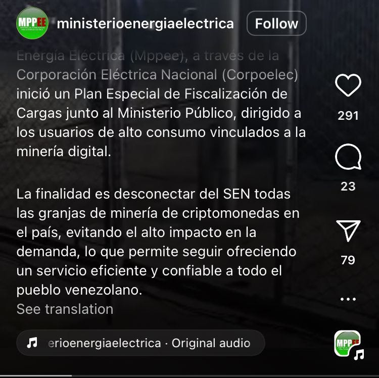 Venezuela’s power ministry on social media announced it would be disconnecting crypto mining farms.